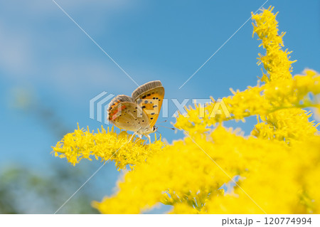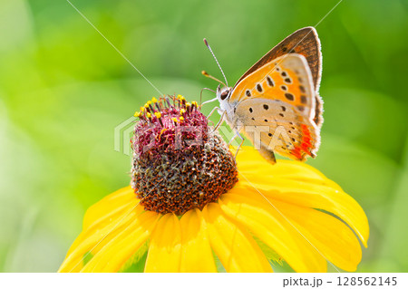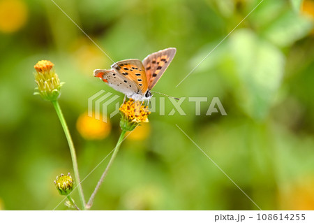 一隻美麗的橙色銅蝴蝶落在一朵小花上。