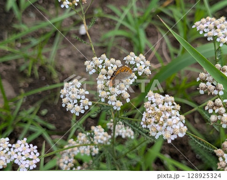 初夏,一隻銅色蝴蝶停在花園裡盛開的白色蓍草上