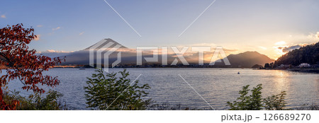 Panoramic view of Mount Fuji at sunset with golden light illuminating the volcano and Lake Kawaguchi