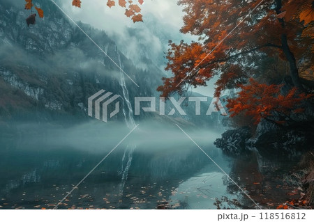 Japanese art style. A mountain range with a red sun in the sky. The mountains are covered in mist and the sun is setting