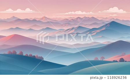 A pastel pink and blue sunset landscape with rolling hills, mountains, sky with clouds. The serene and picturesque scene. Ai digital painting