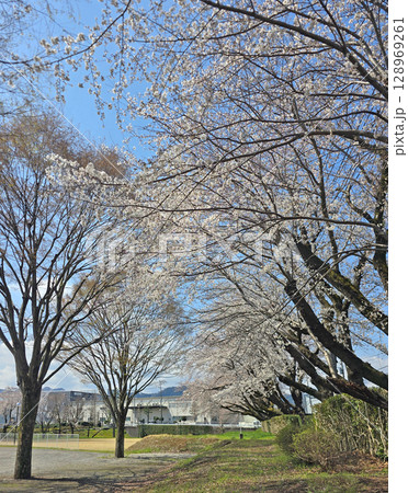 Serene sptime scene featu a narrow river flanked by blooming cherry blossom trees with pink flowers and lush greenery under a bright sky