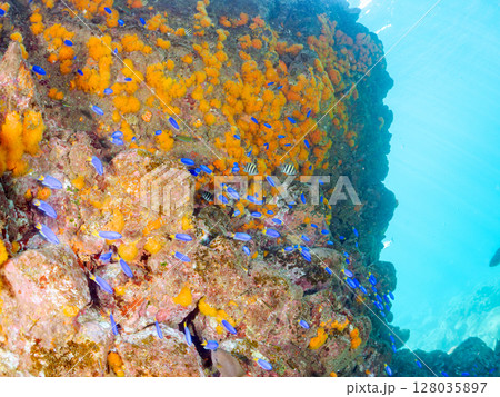 2024年,伊豆半島賀茂郡南伊豆町中木比里藏海岸,一群伊童鯛和一群藍綠色雀鯛,還有大矢鯛和其他魚類