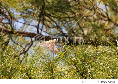 日本最小的鳥,可愛的黃腹紅鴝(科:鶯科),在松樹上飛來飛去尋找食物。 東京都文京區小石川植物園