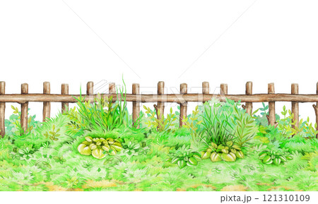 Green grassy ground with old wooden fence seamless border. Hand drawn watercolor illustration. Lush green grass border with fence countryside, village and farm landscape element on white background