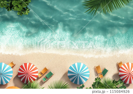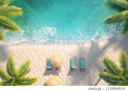 夏季熱帶海灘遮陽傘躺椅與棕櫚樹
