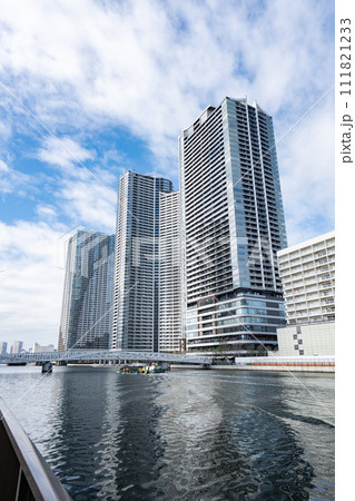 豐洲、江東區、東京丰洲中心大樓和豐洲灣畔十字塔的城市景觀