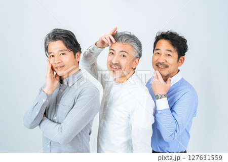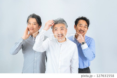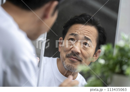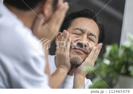 一名中年男子在鏡子前把手放在臉頰上的護膚圖片