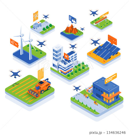Smart city 3d isometric concept in outline design for web. People living in green urban infrastructure isometry rooms with solar and wind energy plants and waste recycling. Vector illustration.