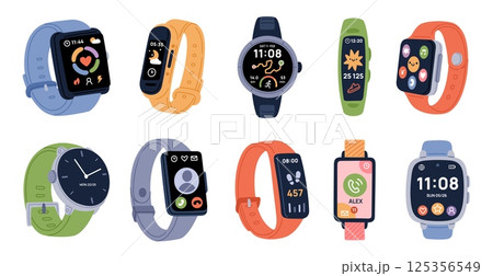 Cartoon smart watches. Digital fitness trackers, different displays shapes, mobile apps, healthy, sport lifestyle gadgets, silicone bracelet, electronic smartwatch, garish vector isolated set