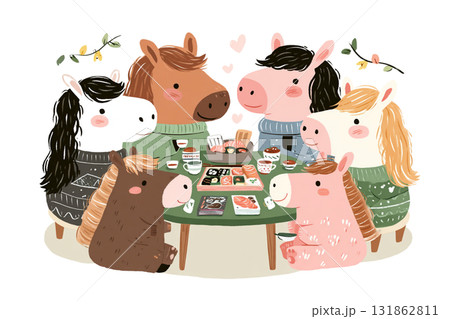 描繪馬一家圍著年夜飯的插圖。新年慶祝場景。可愛的十二生肖新年卡片素材。