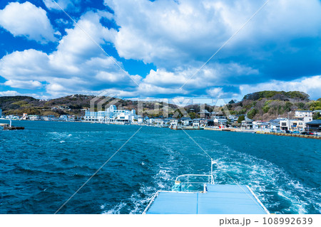 岡山縣瀨戶內市,夏季,從牛窗橄欖園看到進入牛窗港的前島丸
