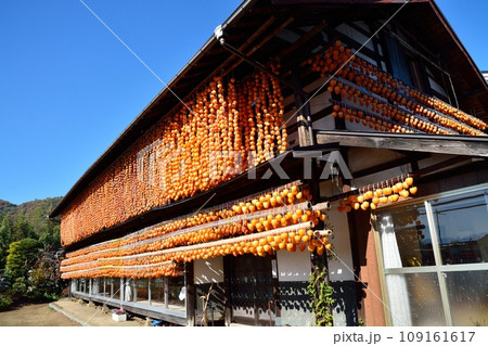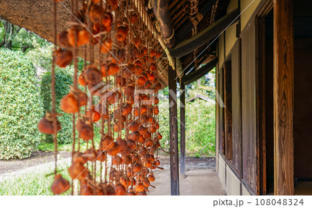 農舍屋簷下掛著秋天的乾柿子