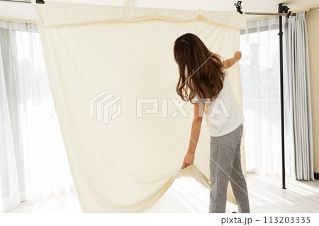 一名婦女將蒲團罩掛在房間裡晾乾。