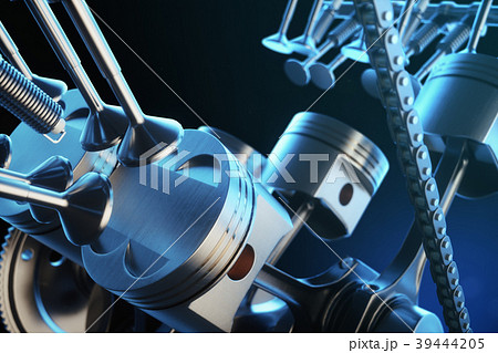 3d rendering of an internal combustion engine. Engine parts, crankshaft, pistons, fuel supply system