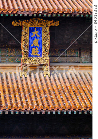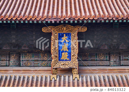 Roof details of the Hall of Great Perfection (Dacheng Hall) of the Confucius temple in Qufu, Shandong province, China