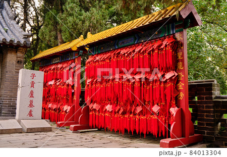 Red wooden prayer tablets at the Temple and Cemetery of Confucius in Qufu, China