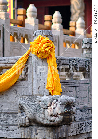 Coiled dragon pillars in front of Dacheng Hall, Temple of Confucius in Qufu, China