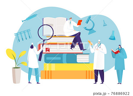 Medical research associate, university higher education institution textbook, tiny student flat vector illustration, isolated on white.