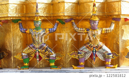 Yaksha guardian statues supporting a golden stupa at Wat Phra Kaew, Bangkok, Thailand. Ornate Thai temple architecture with intricate details and vibrant decorations.