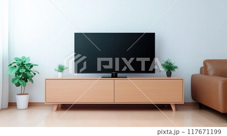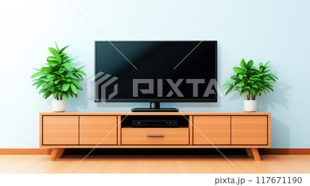 A flat-screen TV displayed on a wooden cabinet in a room with a clean white wall, enhancing the minimalist and modern aesthetic.
