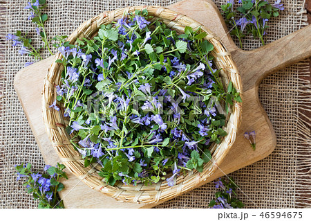 Lemon balm, Melissa officinalis, dried leaves in a wooden bowl and spoon, spread on a rustic wooden table
