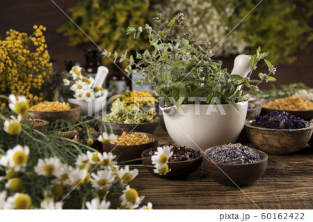 Lemon balm, Melissa officinalis, dried leaves in two wooden bowls with a pestle on a rustic wooden table