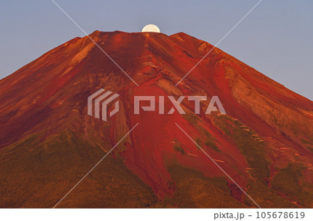 (珍珠富士)富士山在朝霞和滿月的映襯下,珍貴的天體展現