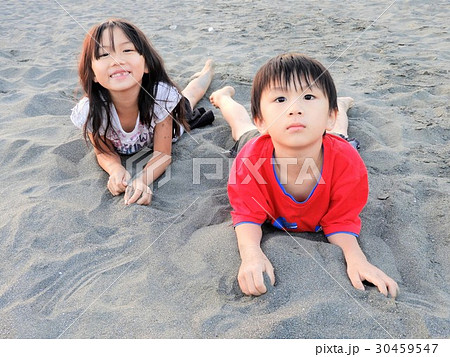 女孩,男孩,小孩,趴著,玩樂,白色,紅色,T恤, 短髮,長髮, 玩沙,沙灘, 漁光島,安平, 月牙灣