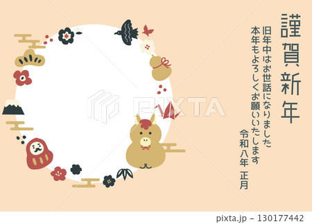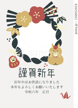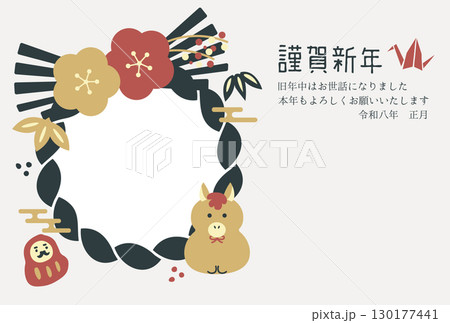 新年賀卡模板照片 馬,日式圖案和水引 03