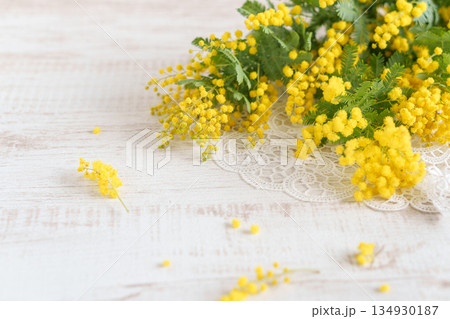 桌上的含羞草花和蕾絲