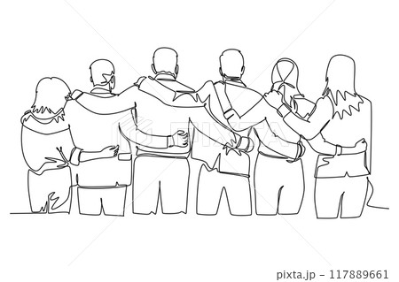 Single one line drawing back view of group men and woman from multi ethnic standing together to show their friendship bonding. Unity in diversity. Continuous line design graphic vector illustration