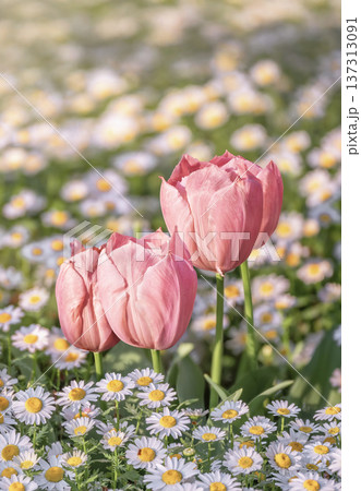 【素材】日式花園中,粉紅色鬱金香被白色雛菊環繞。