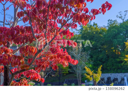 山茱萸樹鮮豔的紅色葉子在蔚藍的秋日天空映襯下格外醒目,營造出一幅生動的自然景觀。