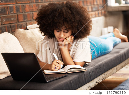 Education, learning and writing with a woman student studying online with her laptop on a sofa in her home living room. Study, growth and development with a female learner taking notes for an exam