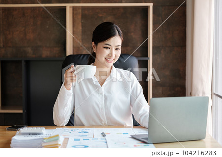 Charming Young asian businesswoman sitting on laptop computer in the office, making report calculating balance Internal Revenue Service checking document.