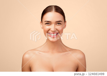Portrait Of Cheerful Young Lady Smiling Looking At Camera Posing Shirtless In Studio Standing Over Gray Background. Headshot Of Gorgeous Naked Woman Expressing Positive Emotions. Natural Female Beauty