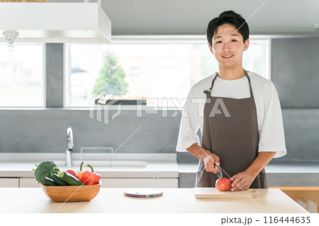 亞洲年輕男子、家庭主婦、丈夫在廚房做飯和做家事(刀、切菜、蔬菜、番茄)