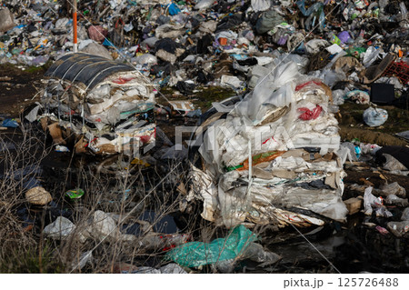 Garbage dump landscape. Open-air landfill. Ecological damage, contaminated land