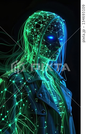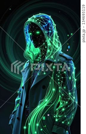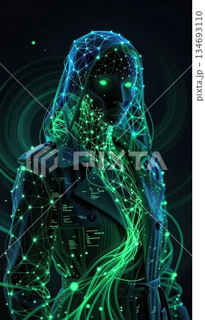 Futuristic Cyberpunk Hacker in Neon Hood with Glowing Green Digital Network Lines.