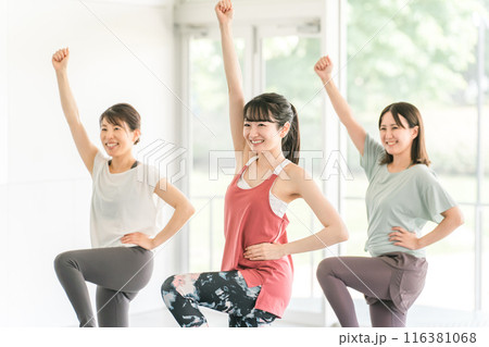 Young woman doing yoga in group in studio