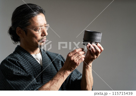 一個穿著日本服裝的男人看著陶瓷、陶藝家、鑑賞家的形象