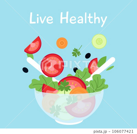 Diet food poster with vegetables salad bowl and cutlery. Vegetarian healthy lunch or dinner. Tomatoes, cucumber cut and green, decent vector card