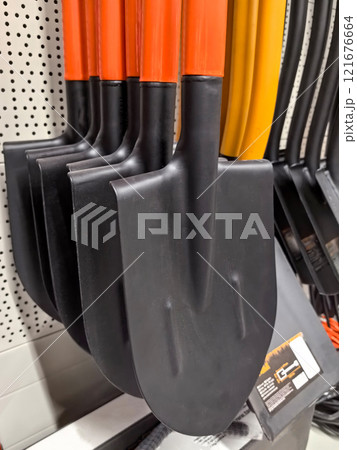 Shovels lined up for gardening and landscaping projects in a store