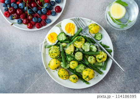 Boiled potatoes with asparagus beans and cucumbers