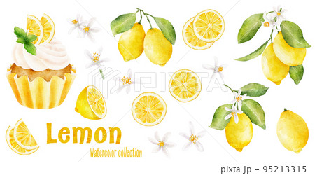 Set of lemons, flowers and cupcake with lemon and mint isolated on white background.