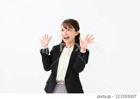 全身穿著西裝的商務男女,在灰色背景中,握著拳頭,看著相機