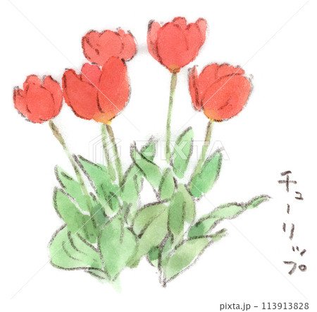 鮮紅色鬱金香的水彩插圖,從春天到初夏的花朵