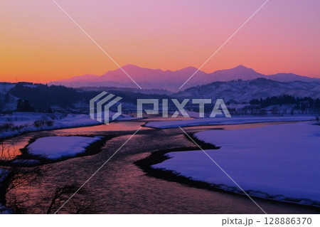 初冬時節,越後三山和信濃川白雪皚皚,景色迷人。