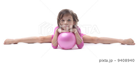 Stately little artistic gymnast posing with ball